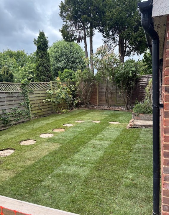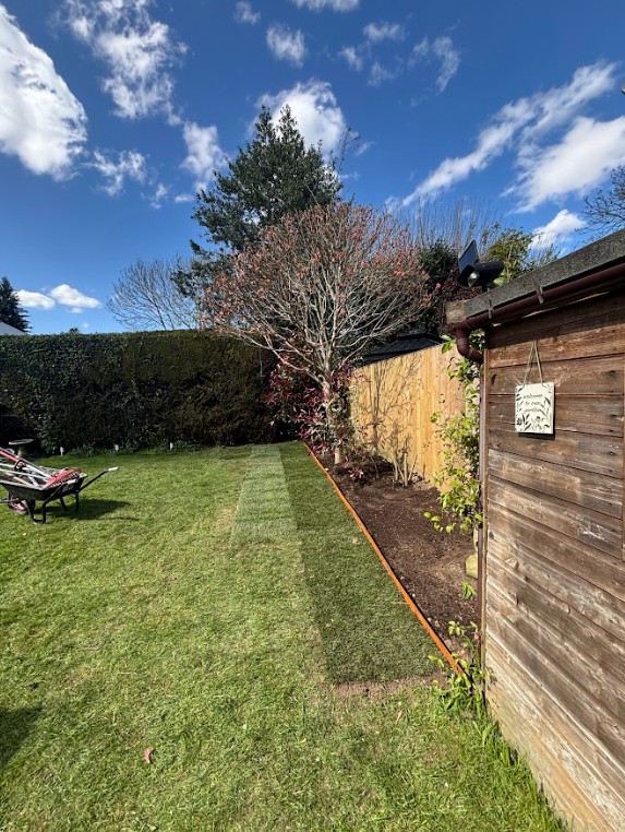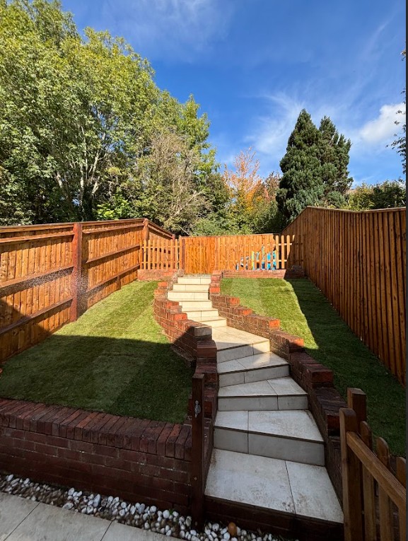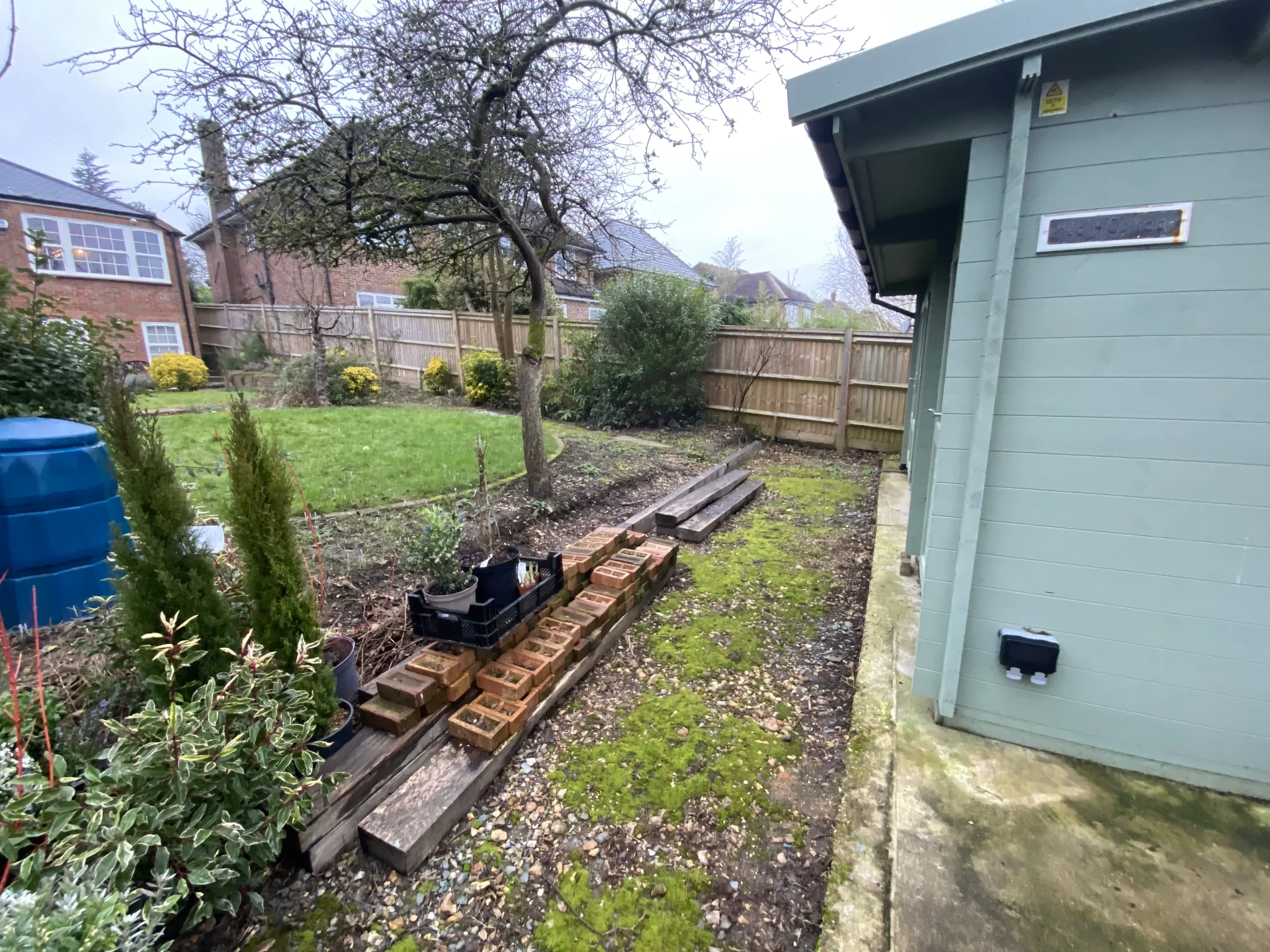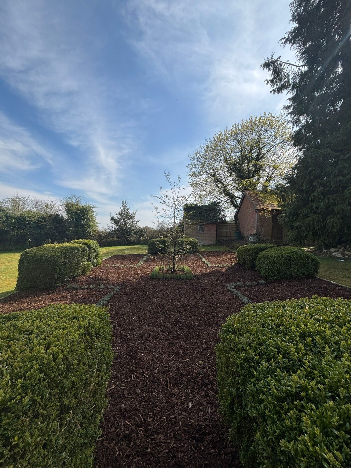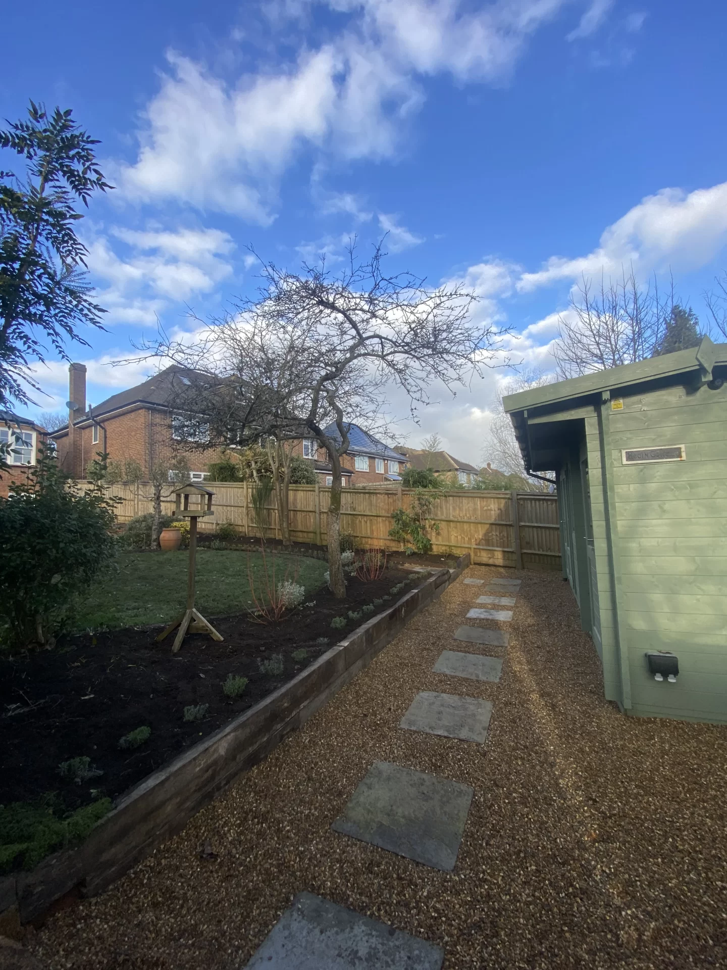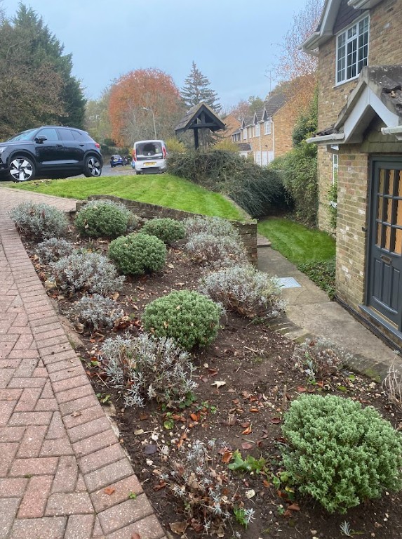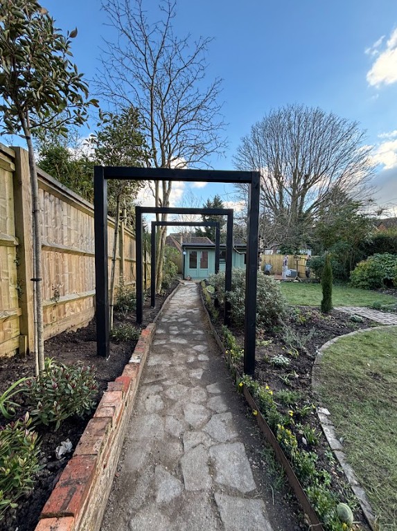 This was a full garden transformation featuring a wooden frame to walk under, painted in dark tones to create a striking wow factor. We planted a long line of Photinia trees, underplanted with blue and white Agapanthus and Hebe, achieving a look that is both simple and lushly showy. The brick wall was raised to provide ample soil depth, and a metal edging was added around the borders for a clean, finished appearance.
