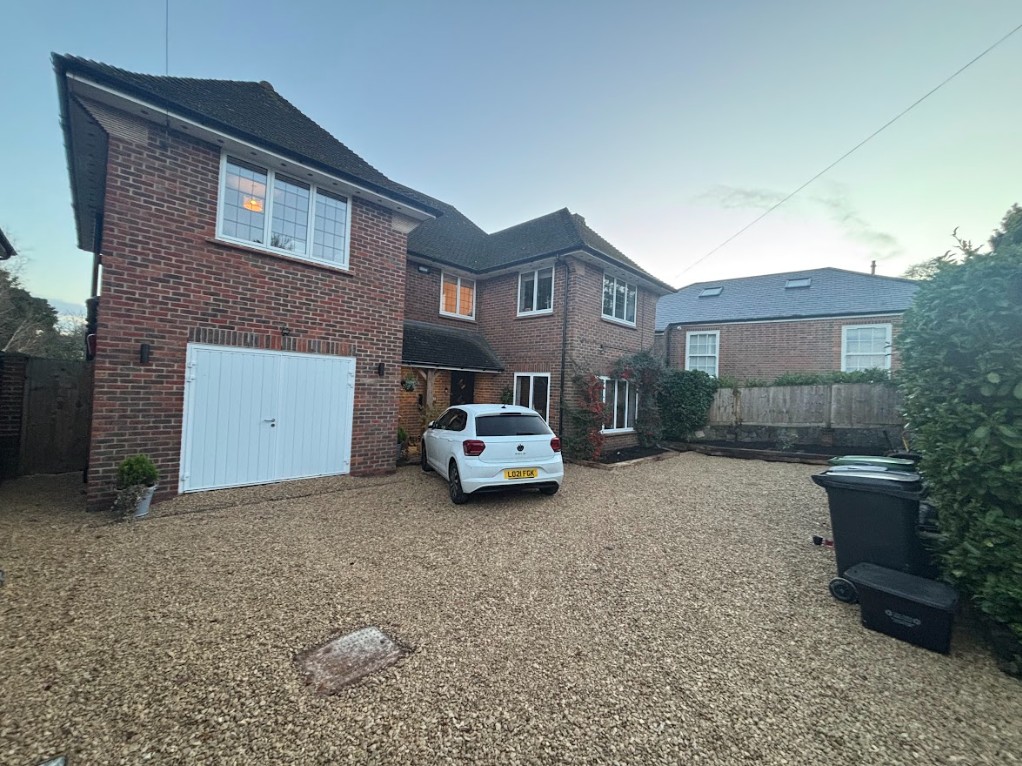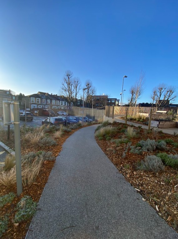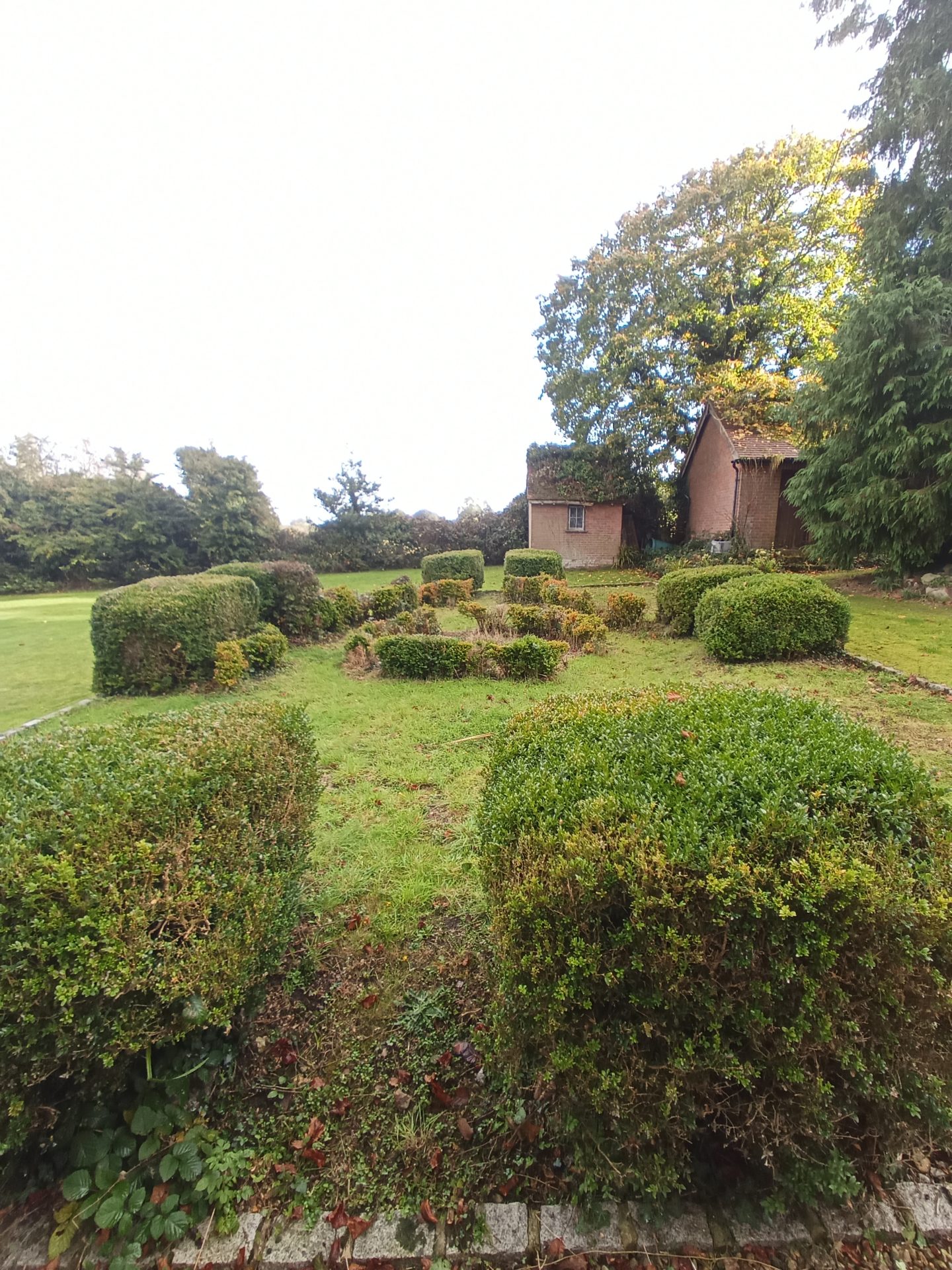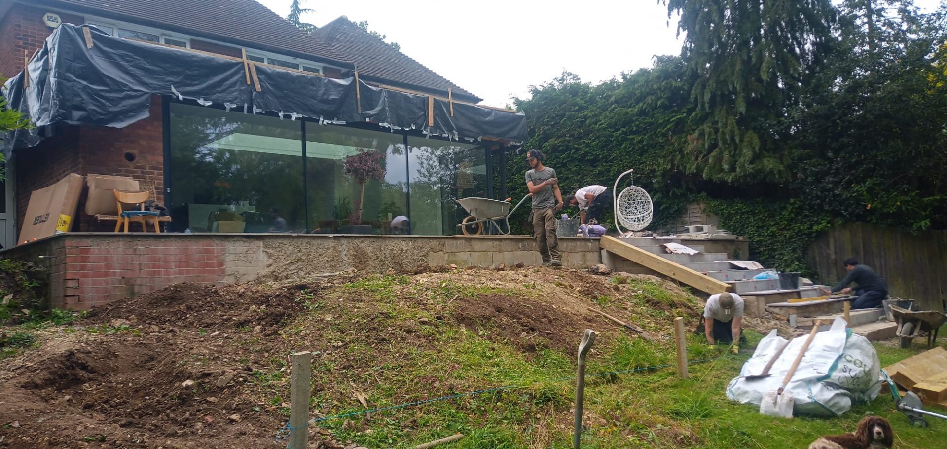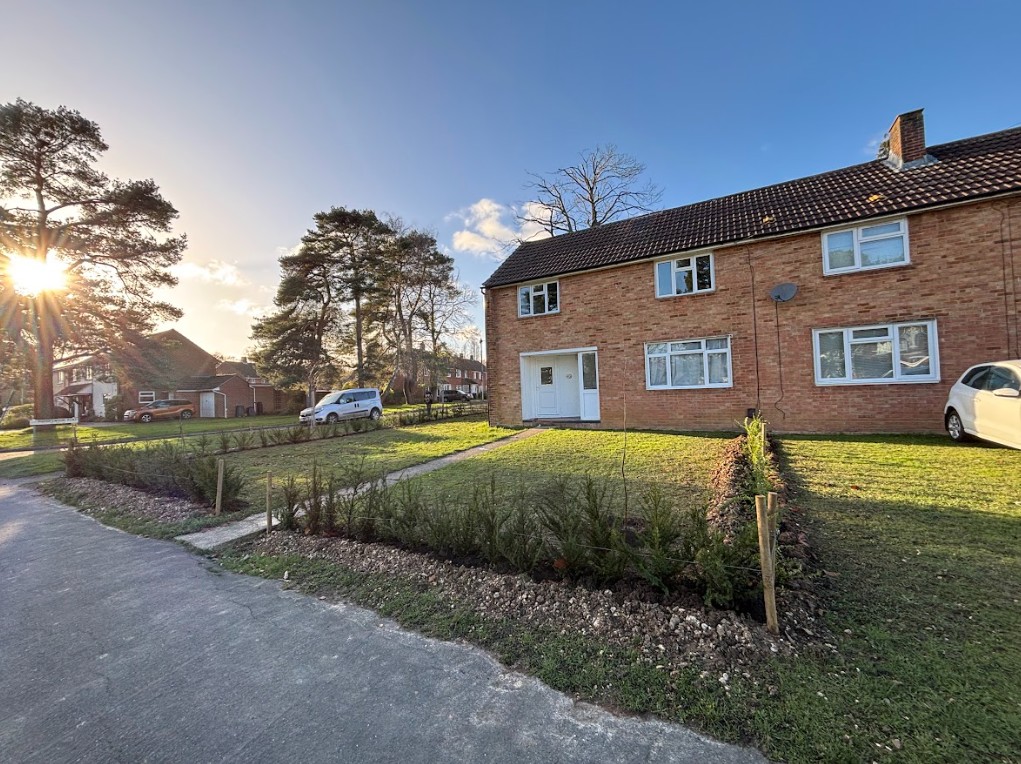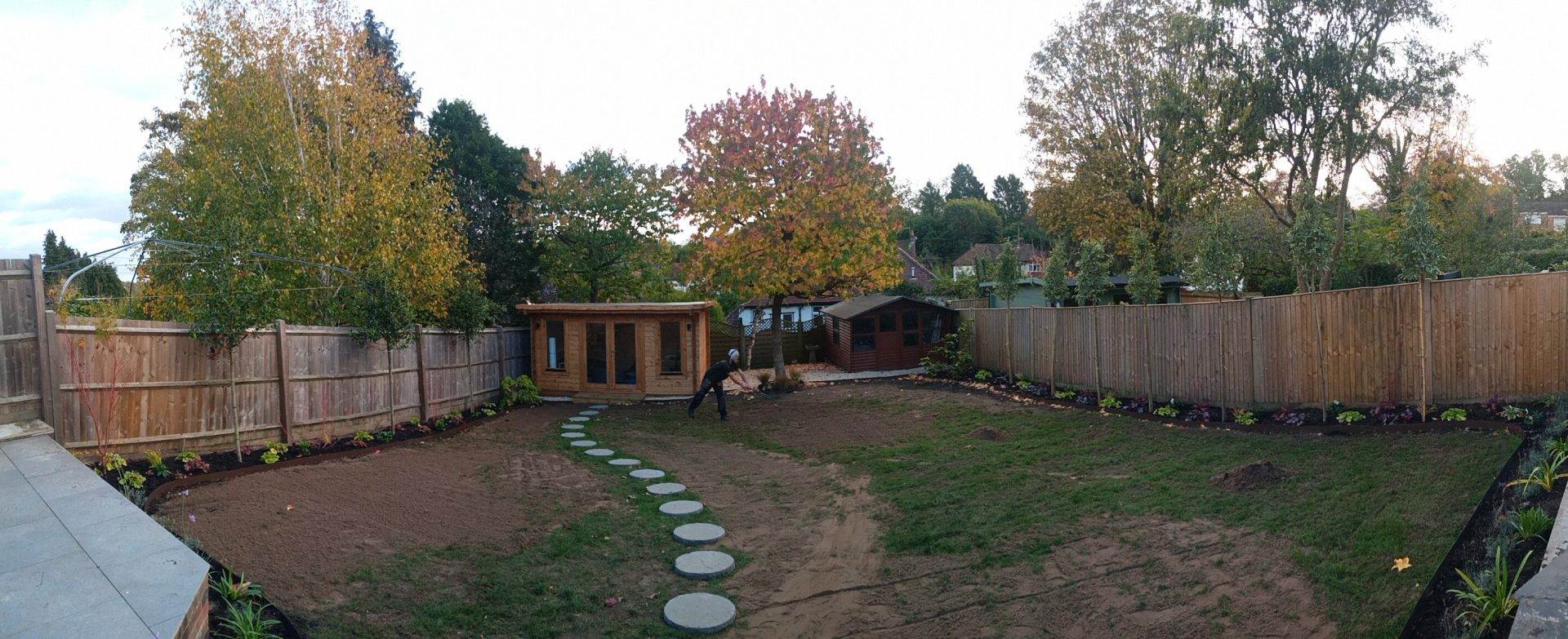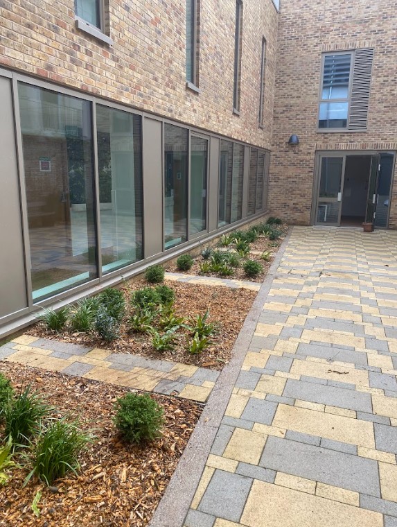 This was a full garden transformation featuring a wooden frame to walk under, painted in dark tones to create a striking wow factor. We planted a long line of Photinia trees, underplanted with blue and white Agapanthus and Hebe, achieving a look that is both simple and lushly showy. The brick wall was raised to provide ample soil depth, and a metal edging was added around the borders for a clean, finished appearance.